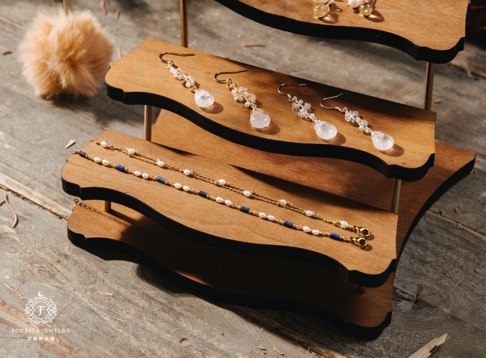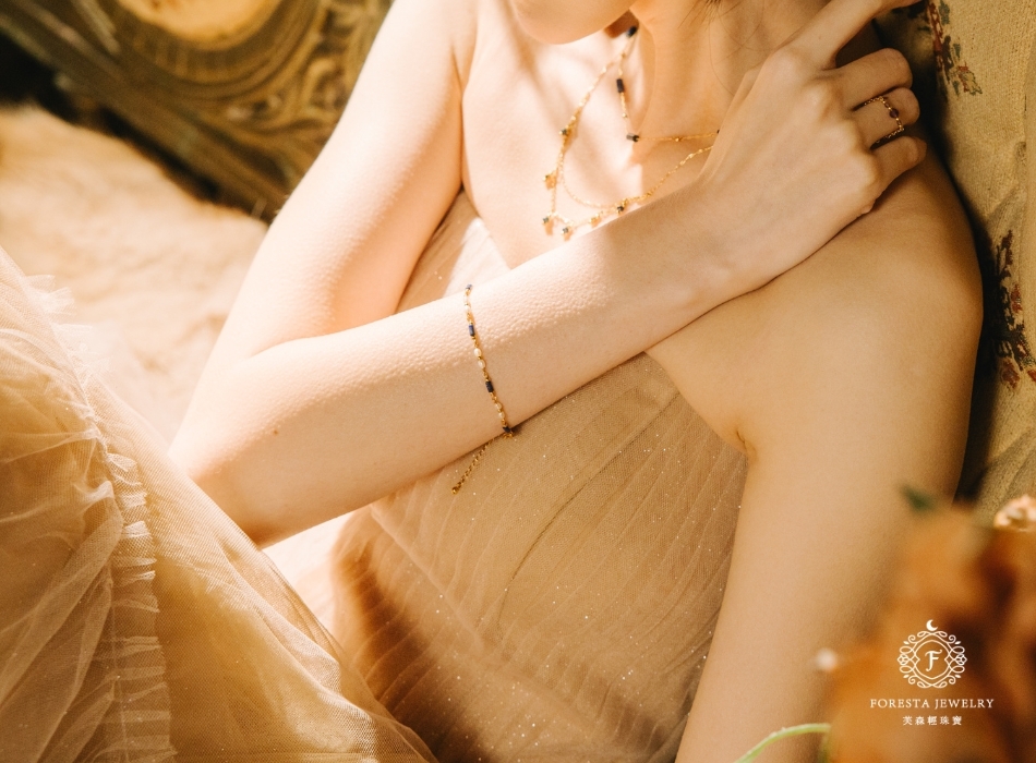 青金石象徵沉穩與洞察,珍珠則如月光般環繞,