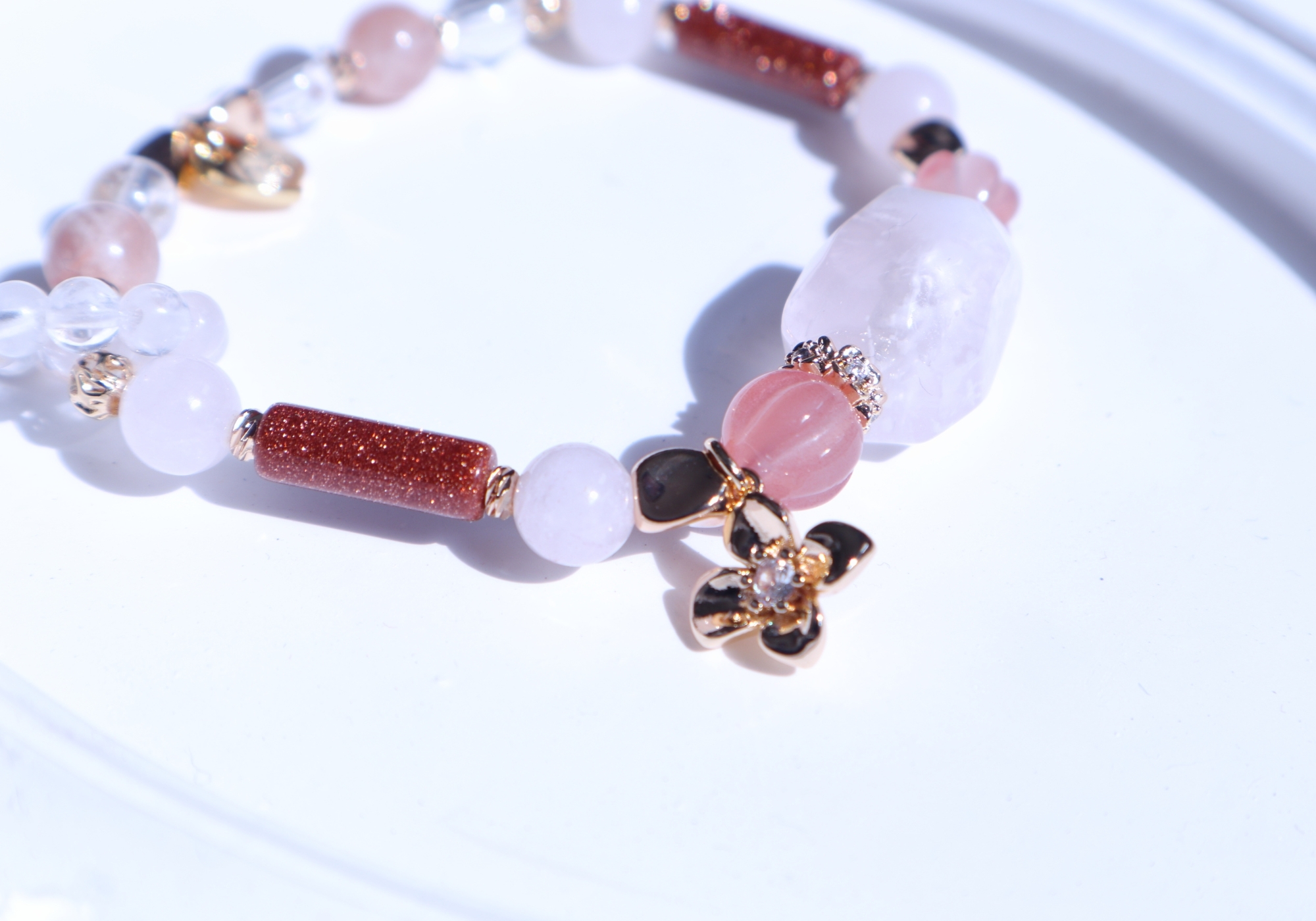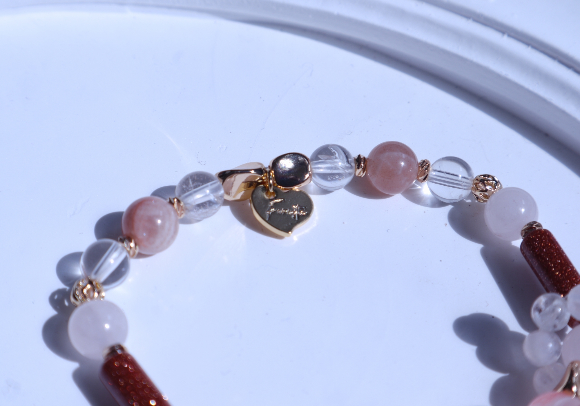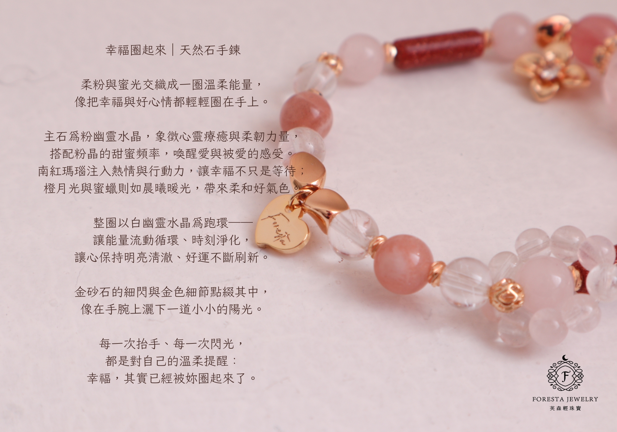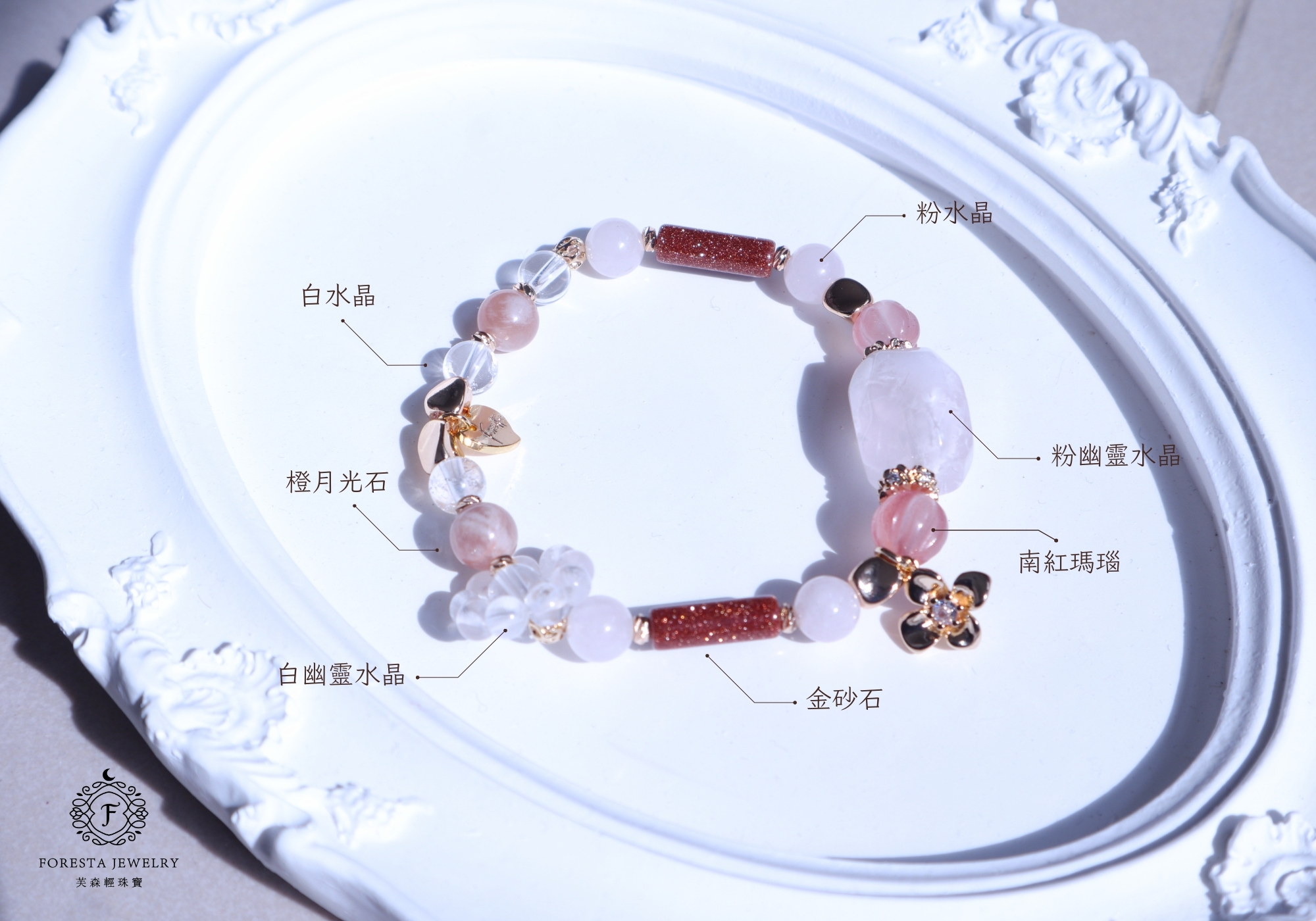 粉幽靈水晶、白幽靈水晶、南紅瑪瑙、粉水晶、白水晶、金砂石、橙月光石