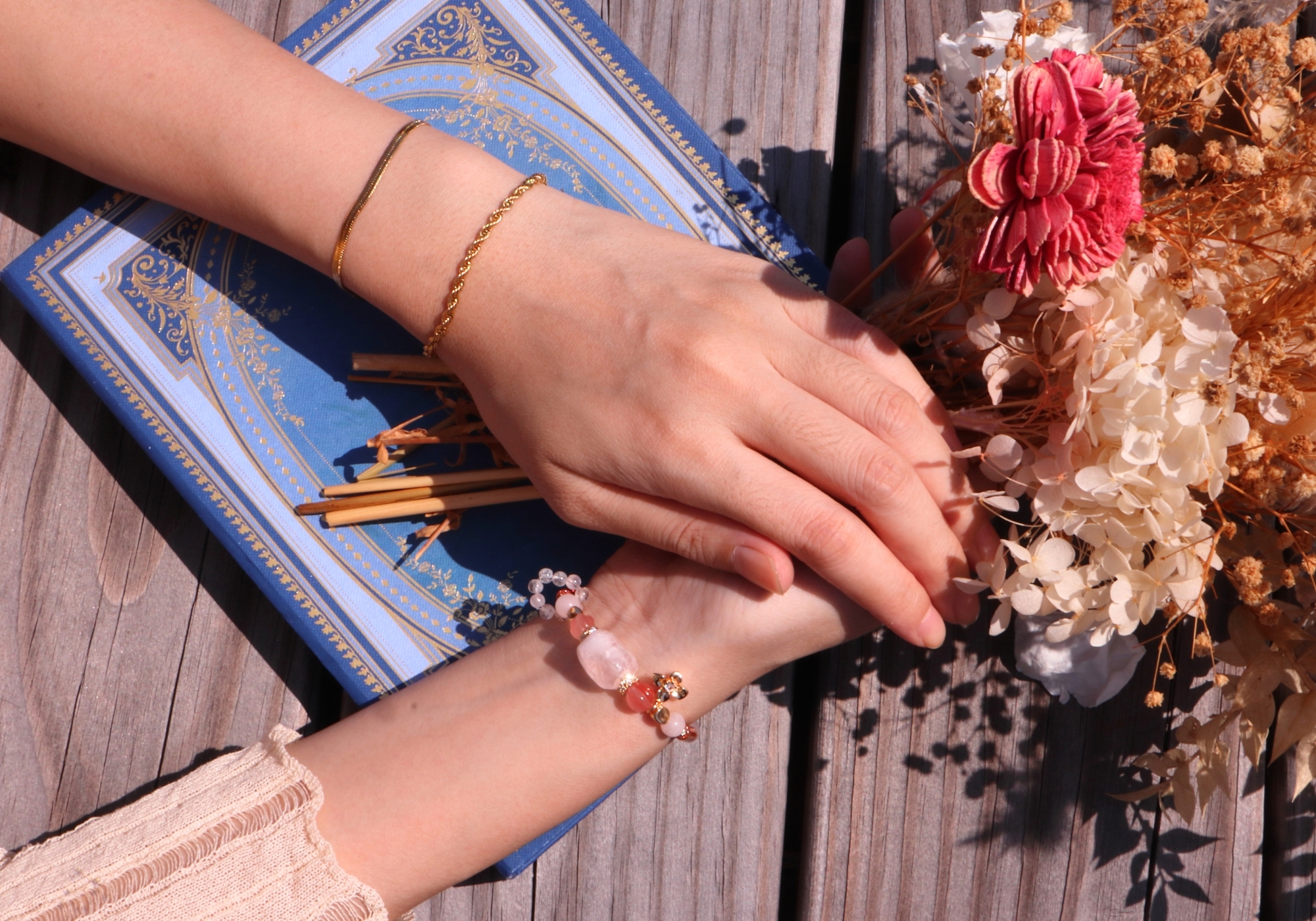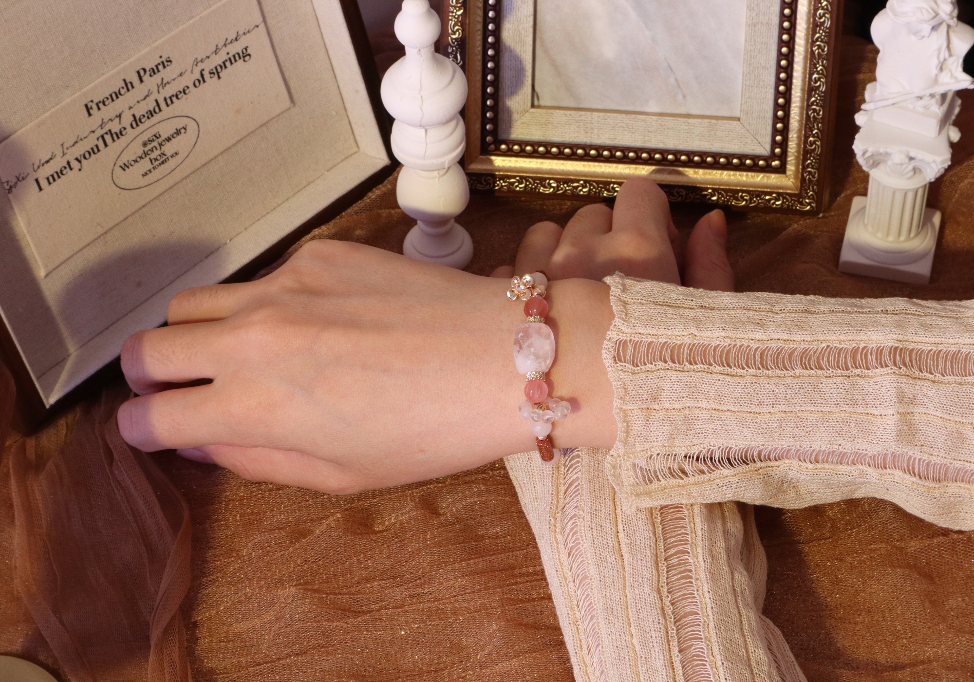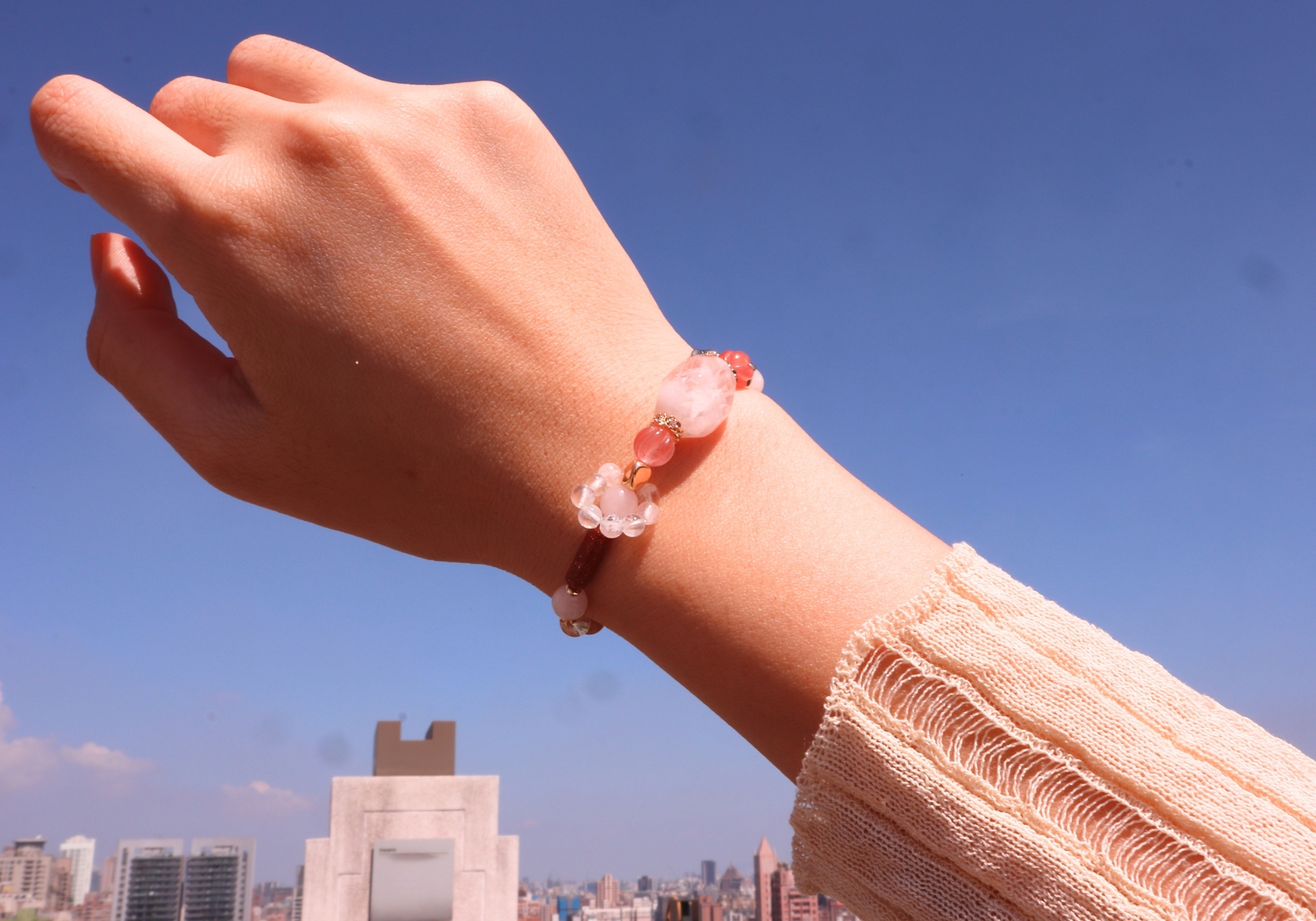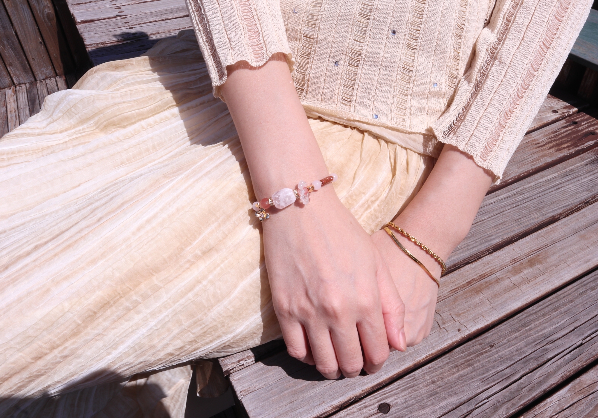 粉幽靈水晶、白幽靈水晶、南紅瑪瑙、粉水晶、白水晶、金砂石、橙月光石