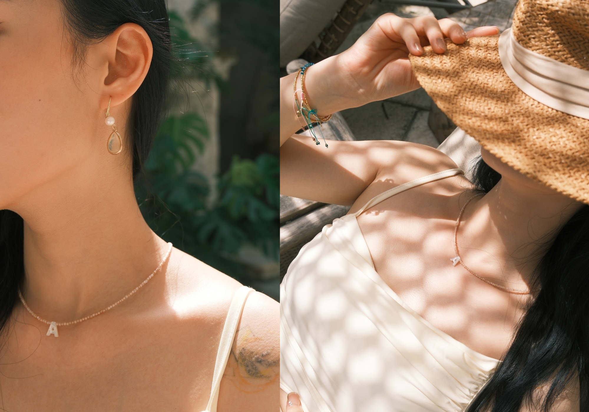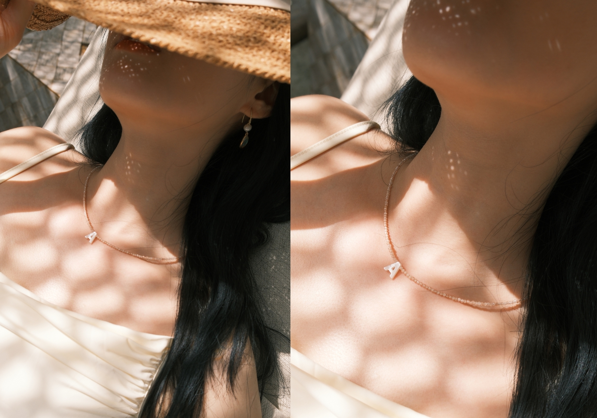 天然珍珠母貝刻成的字母墜子,搭配超閃香檳金鋯石鏈子,