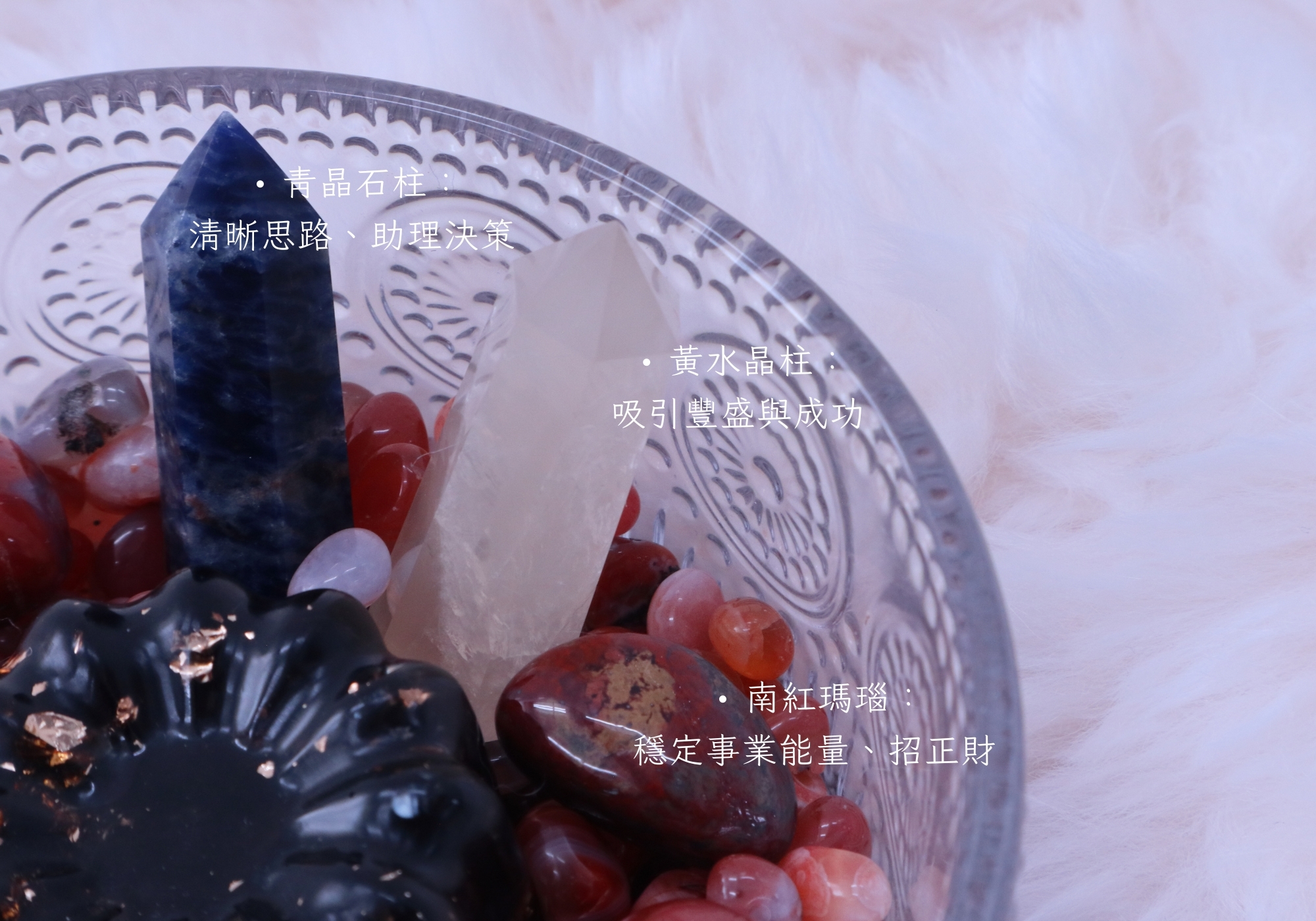 以紅瑪瑙為核心,串聯黃水晶、青晶石與紫水晶愛心,形成事業能量網。